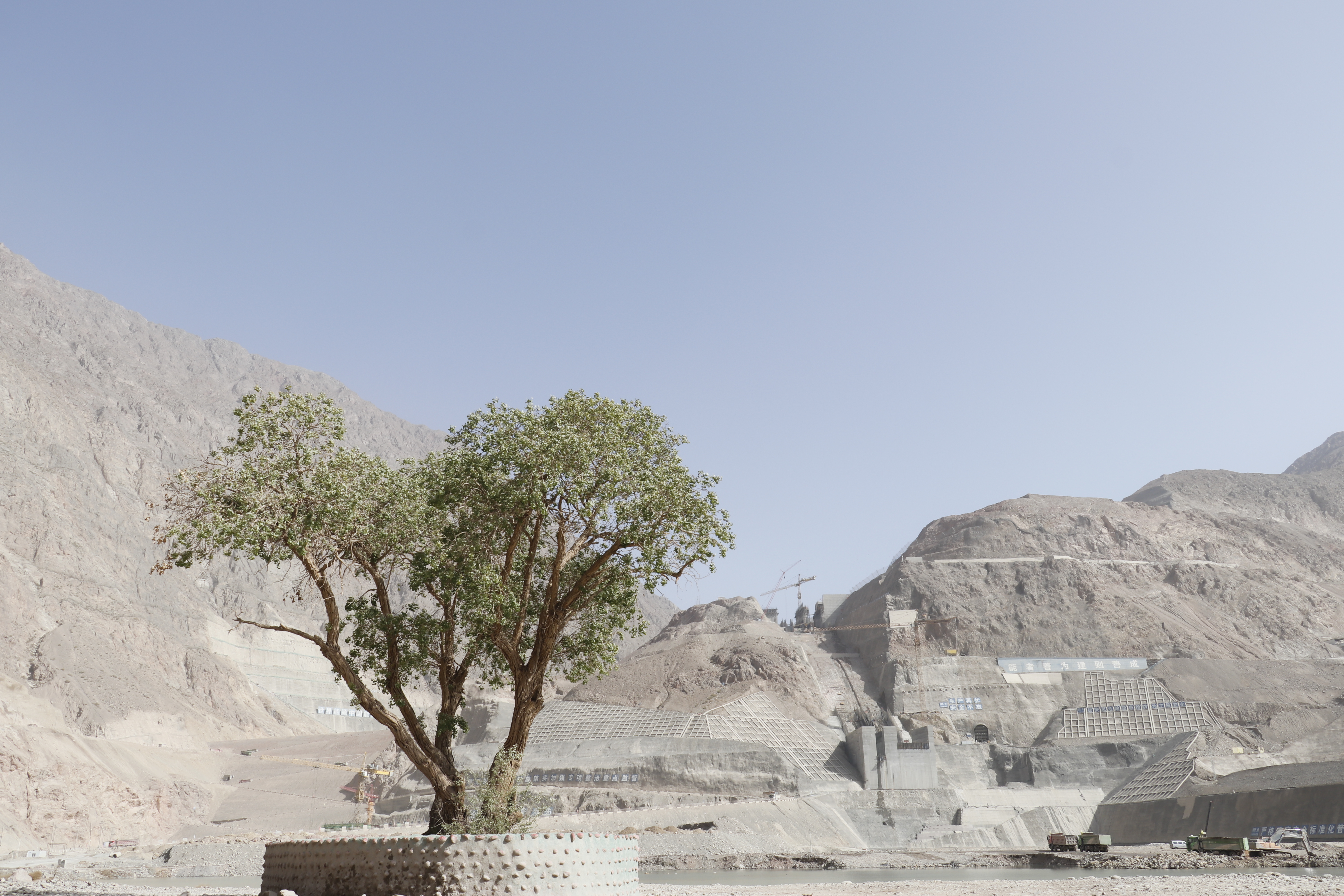 在工程導(dǎo)流洞出口前的河岸邊,幾棵生長(zhǎng)百年的原生胡楊樹,日復(fù)一日見(jiàn)證著大壩的穩(wěn)步增高?,F(xiàn)在,建設(shè)者們?yōu)楹鷹顦湫奁鹆吮Wo(hù)墻,在奮力筑牢大國(guó)重器中等待著春暖樹綠。